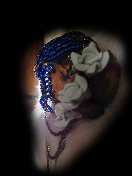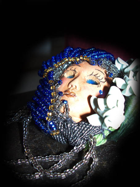 Lady in Blue Brooch Lady in blue...this is a special brooch that combines color and motion...not only does the long dangling glass beads sway and move with any movement but the blue eyes on this piece follow anyone who looks at her. All beads are glass, the whole piece is hand beaded and the blue roses are clay work. Her head is 3 inches with the hanging beads it is 6 inches. Priced at...$85.00 |